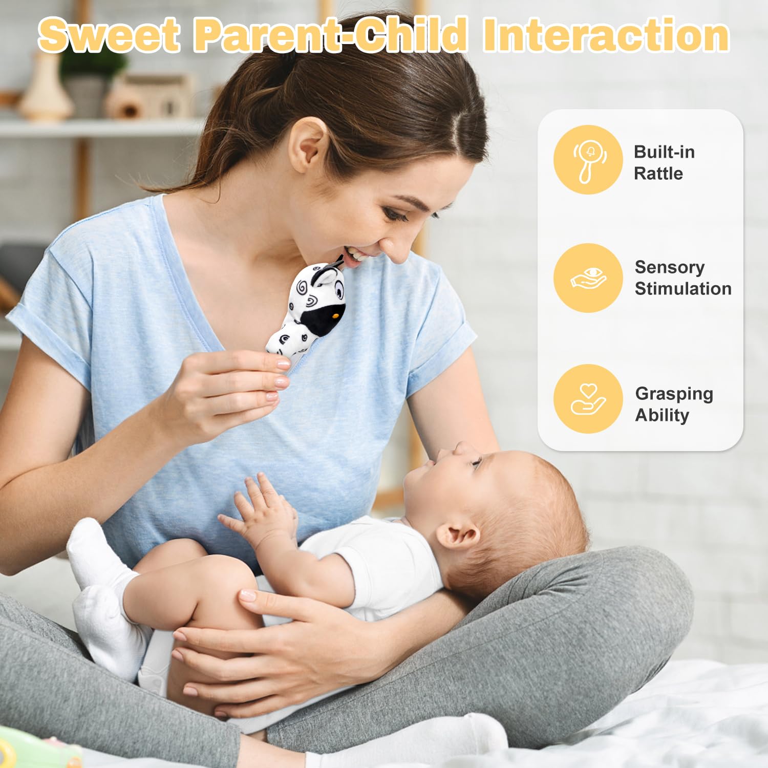 Looking for a unique baby shower gifts?Truly an all-inclusive sensory playtime experience! Stimulating hand, eye and foot coordination.Baby Gift Set Contains【Baby Rattle Socks & Wrist Toys】With adorable animals friends attached to each wearable rattle, thisbaby toys are sure to keep them entertained for hours on end.【Cow Baby Rattle Toy】Black and white baby toys can stimulate early visual development and brain development in newborns, perfect for parents & little hands to share together!【Cow Baby Blanket】Cozy baby blanket choose environment-friendly and safe fabric, microfiber makes baby feel softer, keeps your little one babies comfortable and warm from head to toe.【Cute Cow Baby Onesie】Everyone knows a new child that is always crying can be draining but every time mum picks up this baby onesie and reads these little cute messages, she smiles.【Baby Greeting Card】You’ve waited nine long months to say “Hello Baby!” So whether this bundle of joy is our first baby, or baby number ten, a new baby card is a must send.【Baby Cardboard Suitcase】 After all the gifts have been taken out and used, our baby gift box will become a great little storage box for small keepsakes of your baby's growth.Imagine yourself or your friend receiving this carefully arranged baby gift box filled with love and care!